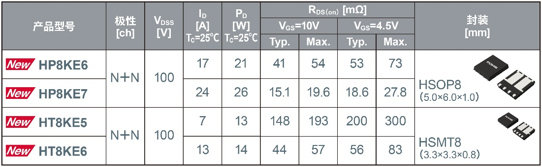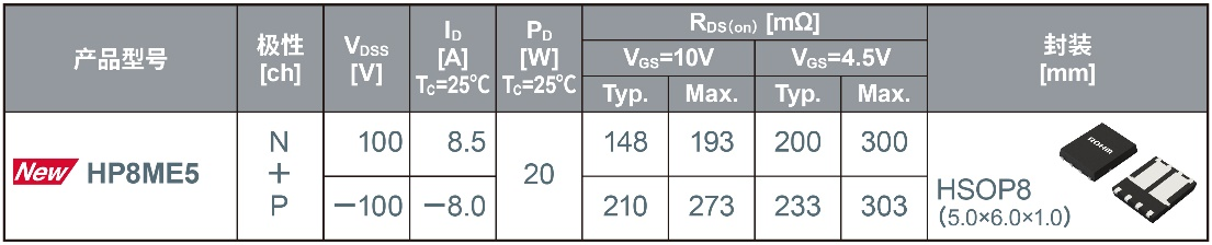 全球知名半导体制造商ROHM(总部位于日本京都市)面向通信基站和工业设备等的风扇电机驱动应用,开发出将两枚100V耐压MOSFET*1一体化封装的双MOSFET新产品。新产品分为“HP8KEx/HT8KEx(Nch+Nch)系列”和“HP8MEx(Nch+Pch*2)系列”两个系列,共5款新机型。