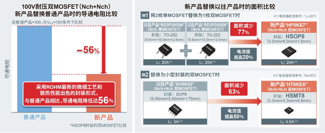 新产品通过采用ROHM新工艺和背面散热封装,实现了业界超低的导通电阻(Ron)*3(Nch+Nch产品为HSOP8:19.6mΩ、HSMT8:57.0mΩ)。与普通的双MOSFET相比,导通电阻降低达56%,非常有助于进一步降低应用设备的功耗。另外,通过将两枚芯片一体化封装,可以减少安装面积,有助于应用设备进一步节省空间。例如HSOP8封装的产品,如果替换掉两枚单MOSFET(仅内置1枚芯片的TO-252封装),可以减少77%的安装面积。