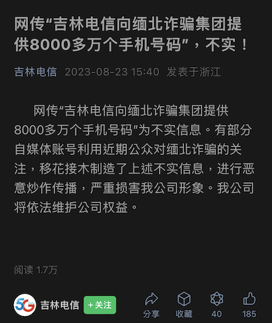 吉林电信:网传向缅北诈骗集团提供8000多万个手机号码信息不实
