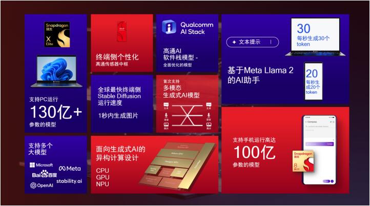 第三代骁龙8能够支持在终端侧运行高达100亿参数的生成式AI模型,并以每秒生成20个token的速度运行大语言模型,仅需不到一秒就能使用Stable Diffusion在智能手机上生成图像,为用户带来响应更快、更高效、更安全的AI体验。而骁龙X Elite是高通公司迄今为止面向PC打造的最强计算处理器。凭借一流的CPU性能、领先的终端侧AI推理和支持多天续航的高能效PC处理器,显著提升PC体验。骁龙X Elite专为AI打造,支持在终端侧运行超过130亿参数的生成式AI模型,凭借快达竞品4.5倍的AI处理速度,将继续扩大我们在AI领域的领先优势。