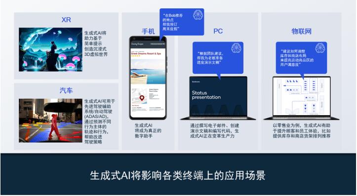 生成式AI的迅速兴起,正驱动新一轮内容生成、搜索和生产力相关用例的发展,覆盖包括智能手机、笔记本电脑和PC、汽车、XR以及物联网等终端品类。而混合AI架构将赋能生成式AI在上述这些终端领域提供全新的增强用户体验。比如,借助生成式AI,智能手机能够成为真正的数字助手,让用户自然地沟通交流,并获得贴切的回答。PC用户可以利用这项技术阅读或撰写电子邮件、起草文档和自动创建演示文稿。在驾乘汽车时,对话式车内助手可以给驾乘者提供丰富的服务。