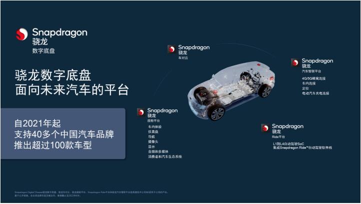 以5G和AI为代表的先进技术,也正在为汽车带来前所未有的变革。我们看到,汽车行业正在加速数字化转型,汽车正在成为“车轮上的联网计算机”。面对行业变革和机遇,高通专注于打造一个助力汽车制造商赋能全新服务、应用和技术转型的平台。骁龙数字底盘的推出,就是我们通过开放合作的方式,共筑行业智能生态的例证。骁龙数字底盘融合了高通在汽车领域众多的产品和技术组合,涵盖连接、座舱、智能驾驶、车对云四大领域。凭借全面丰富的解决方案,骁龙数字底盘获得了合作伙伴的青睐和消费者的认可。自2021年起,骁龙数字底盘支持40多个中国汽车品牌推出超过100款车型。