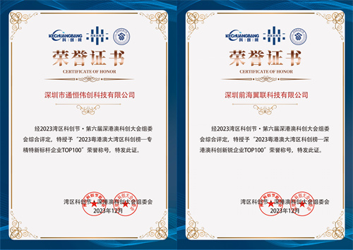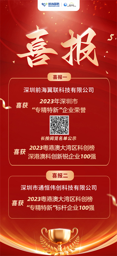 2023年12月30日,由深圳市互联网创业创新服务促进会发起的2023粤港澳大湾区科创榜揭榜发布&科创之星颁奖活动在深圳隆重举行,深圳市通恒伟创科技有限公司在物联网软硬件开发、智能智造技术能力及产业发展显著成果,荣登2023粤港澳大湾区科创榜--专精特新标杆企业100强。深圳前海翼联科技有限公司荣登粤港澳大湾区科创榜--深港澳大湾区科创新锐企业100强。