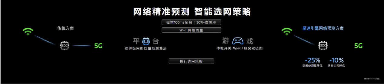 联发科技通过网络质量监测系统,为开发者提供提前100ms、准确率高达90%以上的预测网络质量能力,让游戏网络模块可以快速、精准配置双网并发策略。在保障游戏流畅的前提下,大幅优化双网并发成本,让数据使用量降低25%,整机功耗大幅降低10%,后续联发科还将引入蜂窝网络质量监测,全场景解决游戏网络功耗和流量问题。