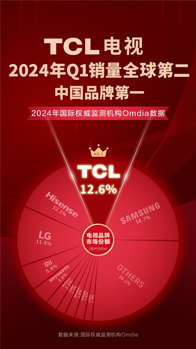 今年一季度,TCL电视全球销量继续走高,Omdia最新数据显示,TCL以12.6%市场占比位居全球第二。国内市场方面,根据近期“618大促”销售数据显示,TCL电视在天猫、京东平台的销量均排名第一。