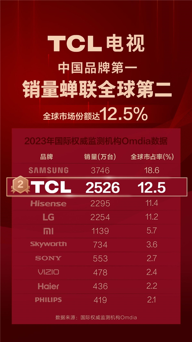 2023年,TCL品牌电视保持全球领先地位,根据国际权威监测机构Omdia数据显示,TCL电视销量市占率达12.5%,位居全球第二。其中,TCL 98吋电视全球销量排名第一。在北美市场,TCL电视出货量同比提升15.8%,零售量在美国排名第二;在拉美区域,TCL电视销量市场份额在巴西排名第三。此外,TCL空调出货量也位列全球前四。