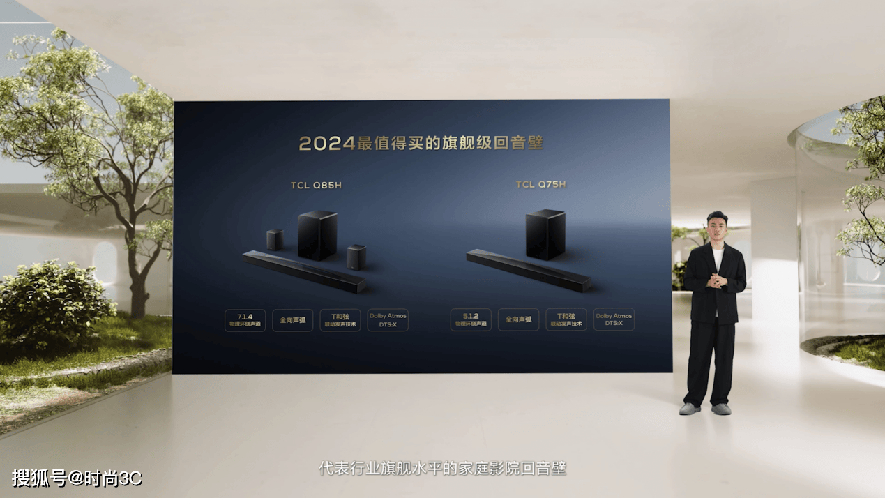 TCL在此次新品发布会上还带来了2024年最值得买的旗舰级回音壁——TCL Q85H(实际到手价3499元)、Q75H(实际到手价2699元)和S系列回音壁——TCL S55H(实际到手价999元)、S45H(实际到手价699元)。其中,TCL Q85H依靠7.1.4 物理环绕声道、全向声弧、T和弦联动发声技术、声场自适应技术、Dolby Atmos和DTS:X认证等行业顶级声学设备技术、算法和调校加持,能大幅提升立体环绕音效果和临场感受,被誉为是影音享受必备Soundbar。