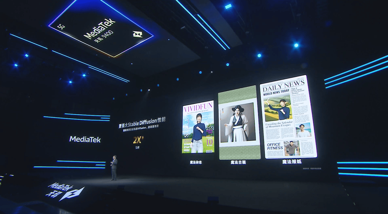 天玑9400还带来了一系列的端侧AI应用底层技术创新。天玑9400的Stable Diffusion性能相较前代提升了2倍,可以根据用户照片的身体姿态,生成各种颇具创意的动图,让用户在手机端侧就可以轻松发挥创造力。