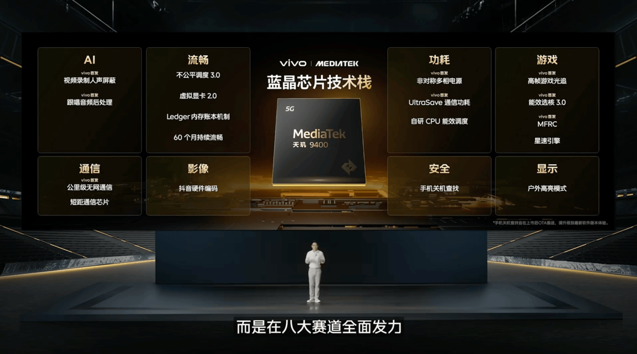 蓝厂与联发科已有多年的合作基础,双方的联合调校覆盖性能、功耗、AI、游戏、通信等八大关键领域,这种长期的合作已经带来了肉眼可见的成果。比如,蓝厂的天玑9400被许多KOL誉为“能效大魔王”,其在性能与能效平衡上的表现赢得了用户广泛认可。