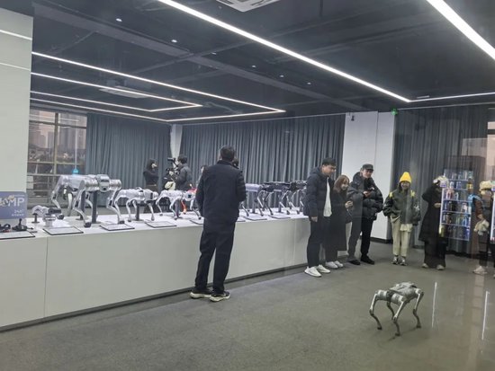 与DeepSeek高大上的办公环境不同,宇树科技显得颇为不起眼,同一栋大楼的标识牌上,一边是宇树科技,另一边是另一家机器人公司。记者到达时,宇树科技工作人员正在演示四足机器人的强大功能,展厅陈列着不同型号的机器人。