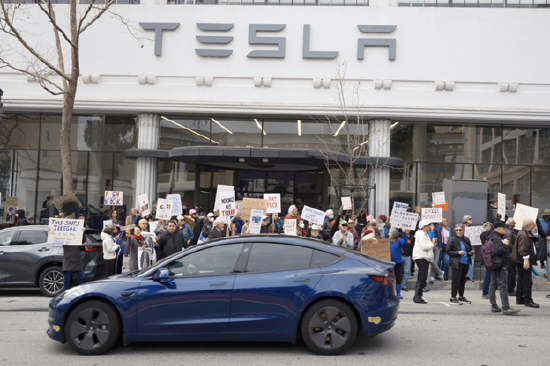 过去两个周六,从旧金山到纽约,美国各地的特斯拉门店都迎来了抗议人群。数十名抗议者站在特斯拉门店高喊口号,他们手中举着的标语写着“别给马斯克送钱”、“亿万富翁偷穷人钱”、“马斯克正在偷走你的钱”、“阻止马斯克政变”、“打倒法西斯”等等。