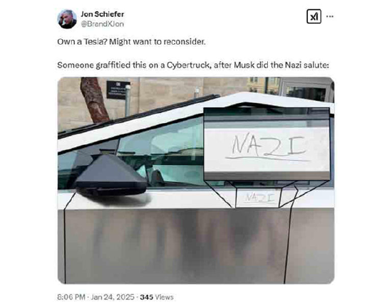在特朗普就职典礼活动上,马斯克在演讲过程中即兴做了一个类似纳粹敬礼的手势,更是点燃了欧洲左派民众的愤怒情绪。虽然马斯克公开否认自己的这个动作与纳粹相关,但考虑到他近期不断支持右派政党,欧洲左派民众依然将愤怒发泄到了特斯拉身上。