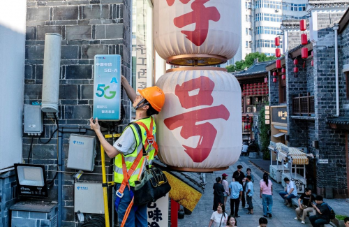 中国电信网络工程师正在南昌万寿宫历史文化街区安装5G-A设备,打造5G-A精品网络示范区。