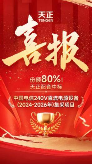 继2024年以100%份额配套中标中国联通240V直流供电系统集中采购项目后,近日,天正电气(605066.SH)在中国电信240V直流电源设备(2024-2026年)集采项目中,凭借高品质的解决方案和服务脱颖而出,再次以80%高份额配套中标,赢得了行业头部客户的高度认可和信赖。