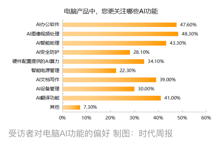 对消费者而言,技术尝鲜或是购买AI数码产品的一大原因,但功能实用性无疑仍是决定性因素。具体到功能层面,如在电脑产品中,最受关注的前五位AI功能是AI图像视频处理、AI办公软件、AI智能助理、AI翻译功能和AI文档写作;在手机产品中,则是AI翻译、AI语音智能助手、AI相机、AI健康检测和AI识图;在学习硬件产品中,则是多思路解题、AI口语训练、学习路径规划、AI作业批改以及护眼与坐姿管理。