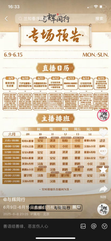 今年5月13日-6月6日,董宇辉仅参与6场直播,总时长13.5小时,平均每场约2.25小时。根据“与辉同行”给出的专场预告,6月9日~6月15日董宇辉只有三场直播,每场两小时,延续去年就有的“不怎么积极”态度。
