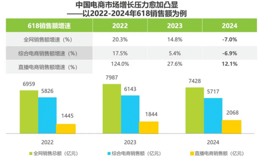 星图数据显示,2024年618总销售额同比下滑7%,是16年来首次负增长;直播电商增速虽然还有12%,但相比前两年124%、27.6%的高增长明显放缓,超头主播挖掘增量的难度也在加大。