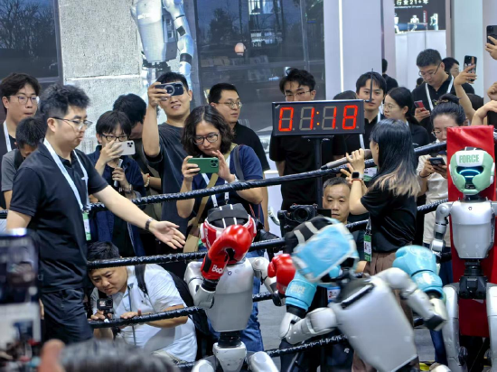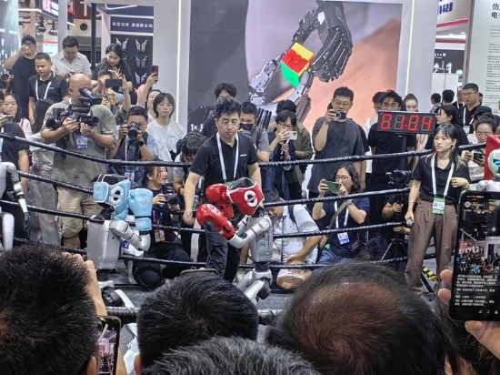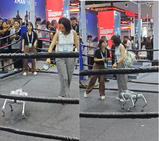 展馆深处,宇树机器人现场摆起了擂台,将此前电视节目中上演的机器人拳击比赛搬到WAIC展馆现场,挥拳、踢腿,现场开干。