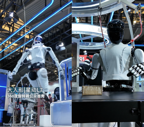 在星纪动元展台,身高171cm、体重65kg的星动L7,现场表演了360度旋转跳、街舞Breaking等高动态动作,同时也演示了分拣包裹、扫码包裹等精细灵巧操作,展现了“力”与“巧”的双面能力。