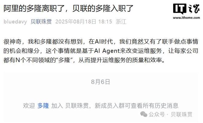 8 月 18 日,据贝联珠贯公众号消息,刚刚离职阿里“扫地僧”多隆已于 8 月 6 日加入贝联珠贯。