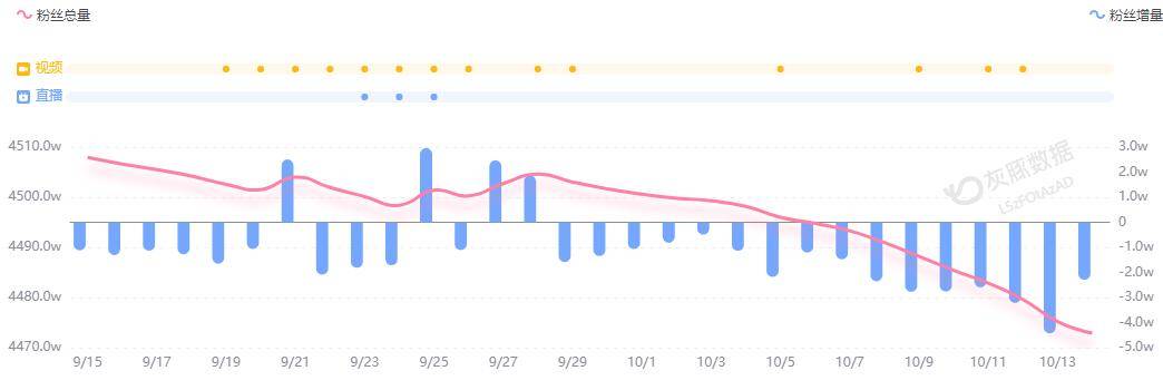 不久前,小米因“小字营销”翻车,雷军被质疑过度营销、人设崩塌,粉丝数量持续下滑。灰豚数据显示,9月15日至10月14日,雷军抖音账号近30日掉粉36.1万。从9月29日开始,雷军的抖音粉丝数量每天都在减少,最近15天减少了30.1万。10月14日,截至红星资本局发稿,雷军抖音粉丝数为4472.9万,两日内掉粉超6万。
