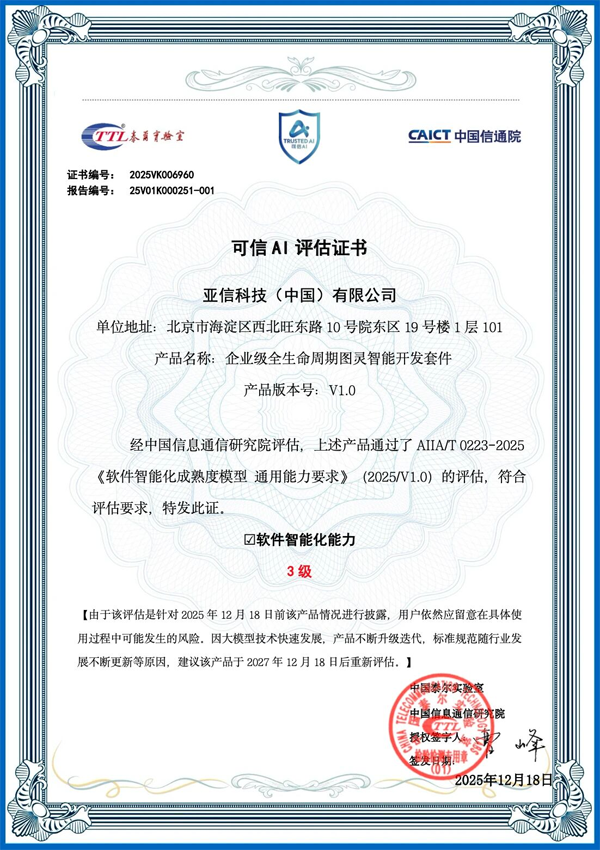 日前,亚信科技凭借图灵智能开发套件(以下简称:图灵)在中国信通院推出的“可信AI”软件智能化能力评估中,成为全国首批通过该项评估的16家企业之一,获评当前最高的“能力三级”认证!