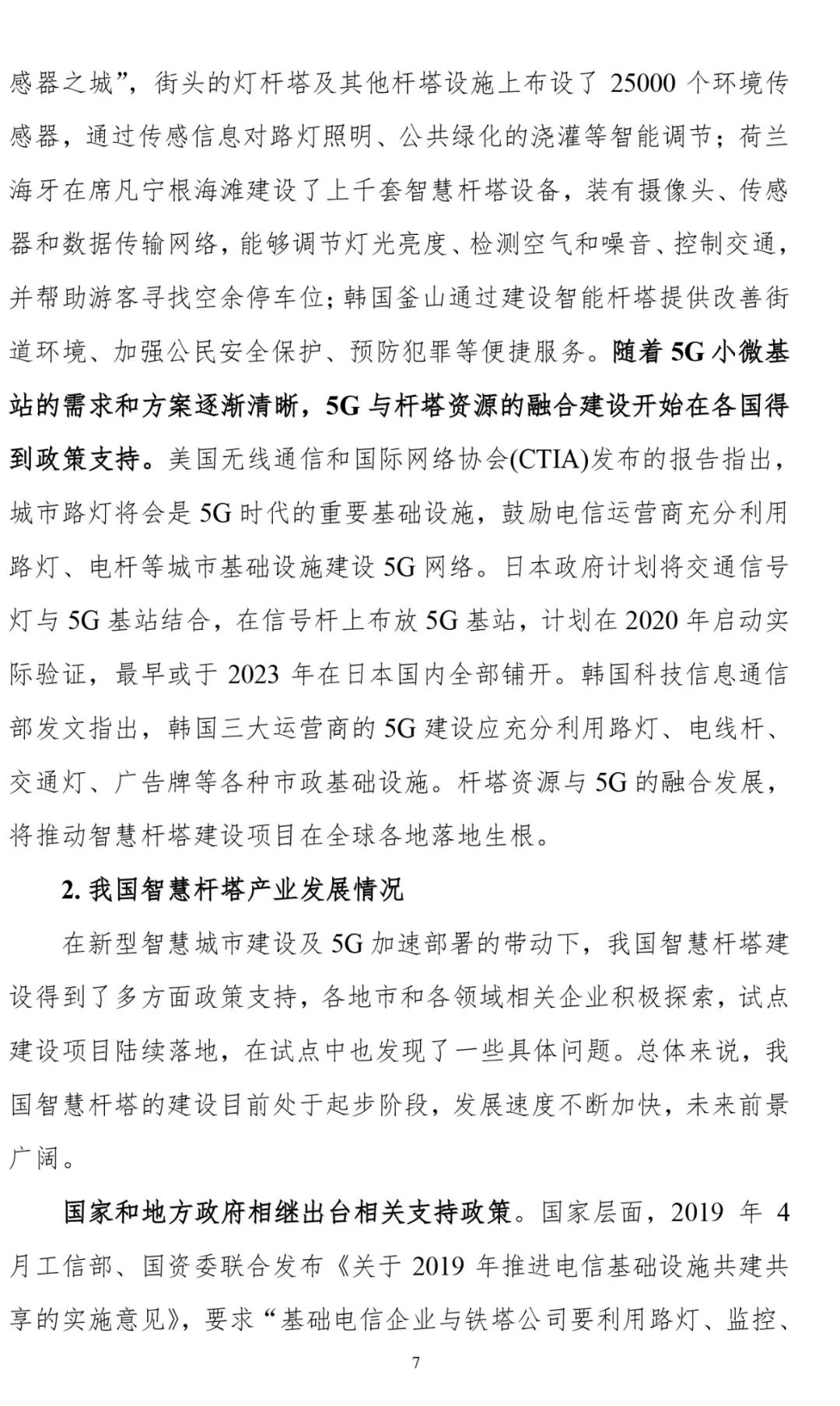 目前整体来看,我国智慧杆塔的建设仍处于起步阶段,但在新型智慧城市建设及5G商用的带动下,相关鼓励政策相继出台,发展呈加速态势,预计未来两三年将会在我国实现突破式增长。
