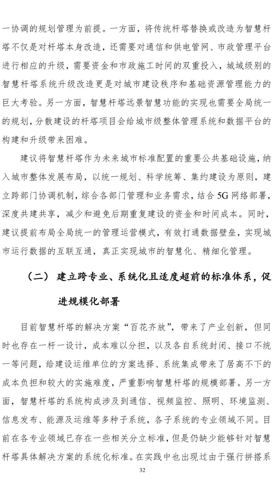 该白皮书深入探讨了智慧杆塔概念、价值与意义,从产业、业务应用、功能及技术需求等多方面全面梳理和解构智慧杆塔特点和发展,在此基础上分析我国智慧杆塔发展亟待解决的关键问题,并从建设规划、标准体系、业务和应用创新、投资运营等角度提出发展建议。