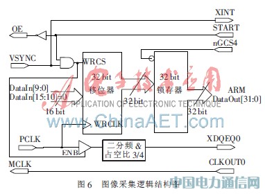 (5)缓冲写入时钟WRCLK由传感器的像元输出时钟PCLK提高,一个周期写入一个10位A/D值,所以一次输出32位数据时,输出时钟周期是PCLK的二分频。并将PCLK的二分频作为S3C2410A外部DMA的请求信号XDREQ。
