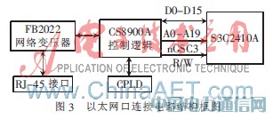 S3C2410A片上没有以太网口,因此必须外加以太网控制器才能扩展。系统采用16位以太网控制器CS8900A,该芯片的特点是:符合IEEE802.3标准,支持全双工收发可达10 Mb/s,内置SRAM收发缓冲,减轻了对主处理器的开销。以太网电路如图3所示,S3C2410A通过16位数据线,20位地址线连接CA8900A。片选信号为nGCS3,即将CS8900A的内部寄存器和帧缓冲区映射到S3C2410A的Band4中连续4 KB的存储区中,主机可以通过这个存储空间直接访问CS8900A的内部寄存器和帧缓冲区。CS8900A与RJ-45接口直接连接一个网络变压器,起到电平转换及电气隔离的作用。此外,CS8900A提供两种操作模式:I/O模式和内存模式,本系统通过CPLD选择其工作模式。
