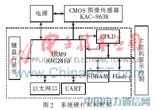 系统总体硬件结构图如图2所示。其中,图像采集器采用柯达公司的CMOS单色图像传感器KAC9638;图像的缓存由CPLD芯片XC95144和外扩SDRM(HY57V561620)组成;图像处理核心部分采用Samsung公司的ARM9(S3C2410A),并外扩了UART、以太网通信接口、USB口及LCD人机接口,方便系统调试和与其他设备交换数据。