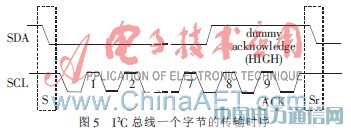 I2C总线是嵌入式系统常见的网络接口,由SCL(串行时钟)和SDA(串行数据)两根总线构成。该总线有严格的时序要求,总线工作时,由串行时钟线SCL传送时钟脉冲,由串行数据线SDA传送数据。总线必须由主设备控制,主设备产生串行时钟控制总线的传输方向,并产生起始和停止条件。I2C总线传输一个字节的时序如图5所示。当主设备写从设备时,传输的数据要跟有从设备的地址。从设备不能主动执行数据传输,所以主控设备读从设备时必须发送一个带有从设备地址的读请求。本系统中ARM9是主设备,图像传感器是从设备,ARM9通过I2C总线改写KAC9638寄存器的值完成初始化。根据I2C通信协议,改变某个寄存器的值的过程是:先发送CMOS传感器特定写地址(7位地址+0),紧接着发送需要写的寄存器的地址,再发送数据;而要读取某个寄存器的值的过程是:先发送CMOS传感器特定写地址,紧接着发送需要读的寄存器的地址,再发送CMOS传感器特定读地址(7位地址+1),最后接收数据。