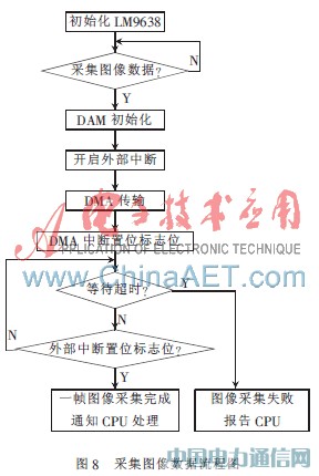 (5)DMA中断产生并且外部中断产生才算是一帧图像采集完成,然后交由主控CPU进行处理。若只有其中一个中断产生,并且等待另一个中断超时,则是在采集过程中丢失了数据,采集图像失败。