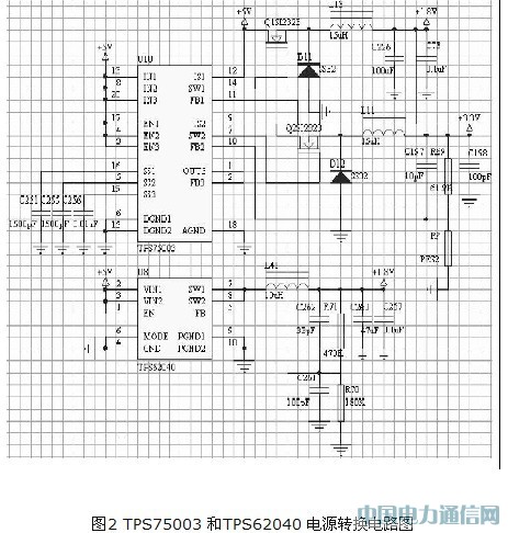 本设计选用TI 公司的TPS75003 和TPS62040 电源管理芯片,T P S 7 5 0 0 3 具有两路最大提供3 A 的拓扑电源和一路300mA LDO 电源,每个Buck 输出电压范围在1.2V 至6.5V 之间,LDO 输出电压范围在0.9V 至6.5V 之间,输入电压范围在2.2V 至6.5V 之间。TPS62040 是高效异步开关DC/DC 转换电源,其转换效率达到95%,输入电压范围在2.5V 至6.0V,输出电压在0.7V 至6.0V,因此都可通过主电源+5V 供电。