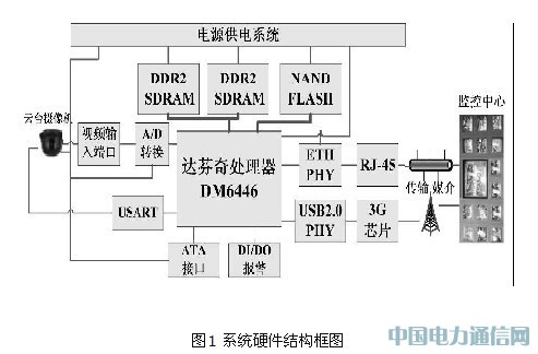 本系统采用的是由达芬奇处理器(TMS320DM6446)、DDR2SDRAM(MT47H64M16)、NAND FLASH(K9F1208X0C)、视频解码器TVP5150、3G 芯片(中兴MC8360)、GPS 卫星定位芯片加上外围接口芯片的方案。CCD 摄像机采集模拟视频信号传入视频解码器内,进行模/ 数转换, 输出符合ITU-BT.656标准的数字视频信号,然后将数字视频信号传到视频处理子系统的前端进行预处理,将数字视频信号通过本人设计的OSD字幕添加算法加入白底黑边字幕后,经过Codec Engine 编码后通过USB2.0 总线端口送入3G 传输芯片,无线传输到远程视频监控中心;达芬奇处理器检测进行卫星定位命令,通过串口接收GPS 卫星定位信息,然后将GPS 卫星定位信息传入到3G 传输芯片,无线传输到远程视频监控中心,在地图上标定其坐标点及其移动轨迹。DM6446 上的DSP 端主要负责视频编解码工作,ARM 端做为控制视频解码芯片、3G 传输芯片、GPS 定位芯片和外围接口芯片的控制器。系统硬件结构框图如图1 所示。