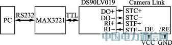 DS90LV019有4种工作模式,模式的选择由DE和/RE两个信号的状态决定。当DE和/RE都为高时,IC工作在驱动模式;当DE和/RE都为低时,IC工作于接收模式;当DE为低,/RE为高时,IC工作在三态模式;当DE为高,/RE为低时,IC工作在全双工模式。这里采用一片DS90LV019作为串行通信LVDS信号的收发器,工作于全双工模式。再用Maxim公司的MAX3221来进行TTL/RS232电平间的转换。控制端通过RS232接口发送的相机命令再通过DS90LV019传送给相机,相机接收后给出的反馈信息再通过DS90LV019和MAX3221传送给控制端。