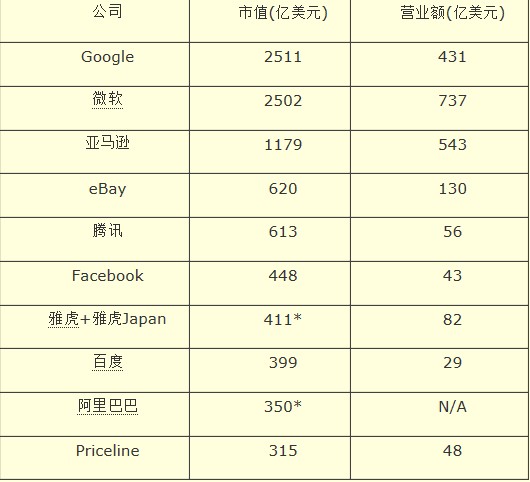 注释:雅虎和雅虎日本是两家单独上市的公司,雅虎持有部分雅虎日本和阿里巴巴的股份,因此市值有重复计算。