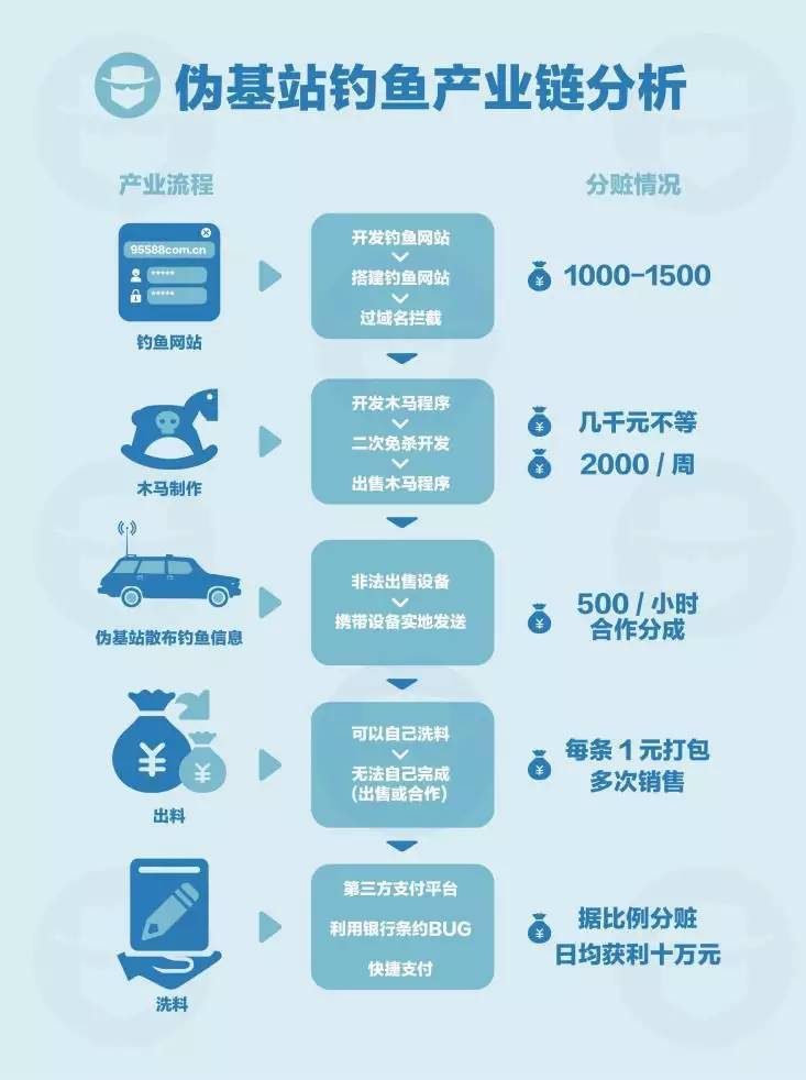 伪基站发送钓鱼短信:这个一般为线下交易,,包吃包住包油钱以每小时500元左右为酬劳或以合作分成的方式,让有伪基站设备的人带着伪基站游走在繁华的街区进行大范围的撒网(发送钓鱼网站)。