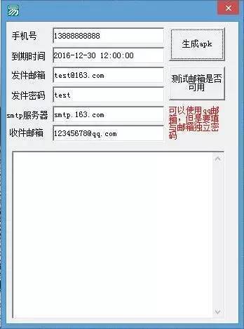 目前我们调查中遇到有两种,一种由编译好的软件填入手机号、发件邮箱账号密码、收件邮箱、木马到期时间即可自动生成一个带有木马病毒的手机APP。(成本小但是利益大,使用无限制,只要利用生成器就可以制作拦截马,导致拦截马泛滥。)