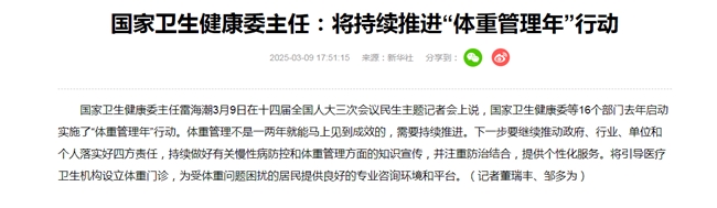 “两会”期间,国家卫生健康委雷海潮主任说,将持续推进“体重管理年”行动,许多同志腰围太大,体重超重,有人甚至患上了慢性病……有关慢性病防控和体重管理,要注重防治结合,提供个性化服务。